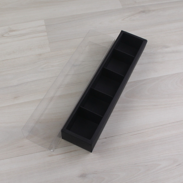 Коробка на 5 конфеты из дизайнерского картона. Крышка прозрачная, тип "Шубер" (задвигается как спичечный коробок) Поставляется разобранной, требуется склейка с помощью двустороннего скотча.
