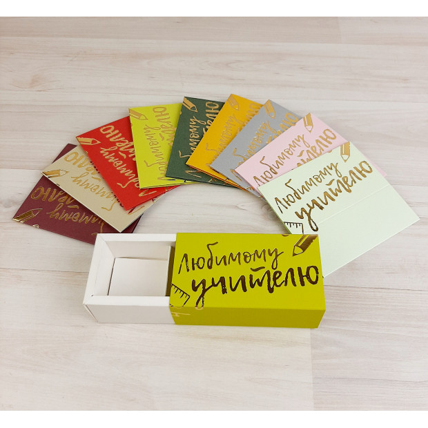 Коробка на 2 конфеты, комплект 10 шт. В каждой пачке случайный набор цветов. Крышка глухая из дизайнерского картона, тип "Шубер" (задвигается как спичечный коробок). Склейка не требуется. Дно, разделитель мелованный картон. Рисунок выполнен при помощи горячего тиснения золотой фольгой.