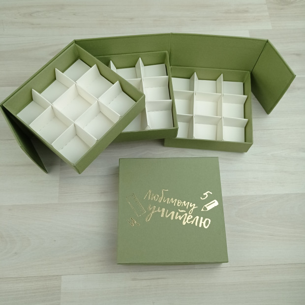 Коробка представляет собой трехярусный раскрывающийся сундучок. Обложка, крышка и ярусы сделаны из толстого переплетного картона и оклеены дизайнерской бумагой. Разделители вырублены из мелованного картона. Тиснение "Любимому учителю" выполнено золотой фольгой.