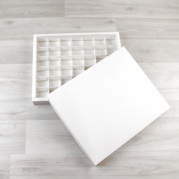 Коробка на 42 конфеты из белого мелованного картона.
