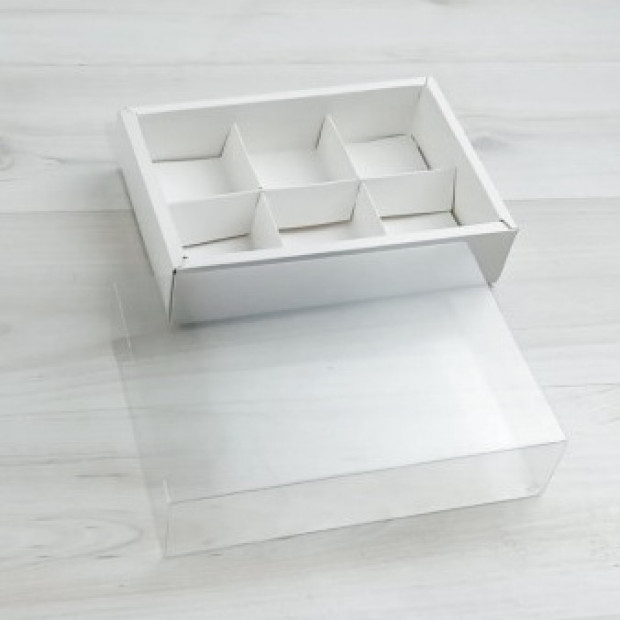Коробка на 6 конфет из белого мелованного картона. Крышка прозрачная, тип "Шубер" (задвигается как спичечный коробок). Поставляется разобранной, склейка крышки не требуется. Склейка шуберов производится полупрозрачной белой клеевой лентой, место склейки не является прозрачным.