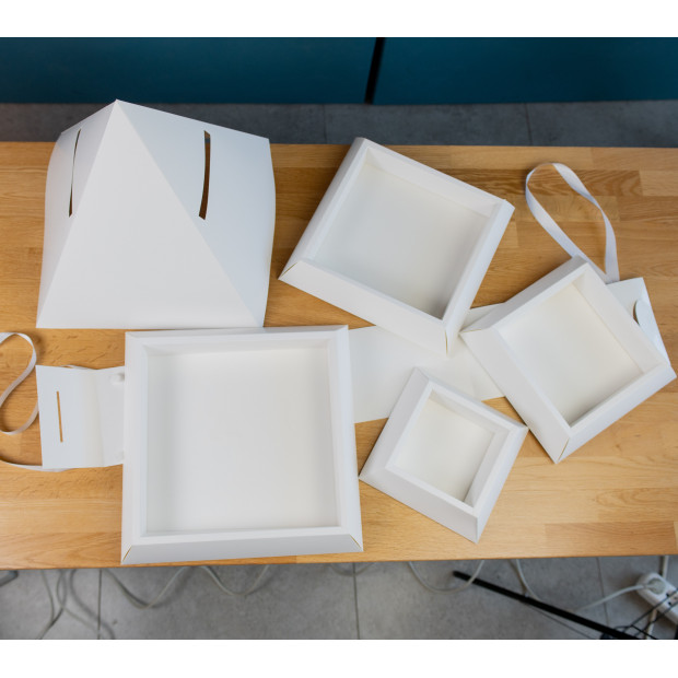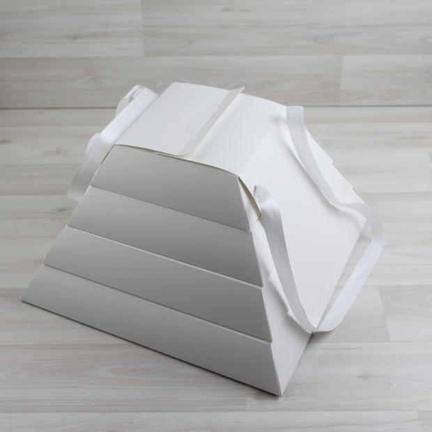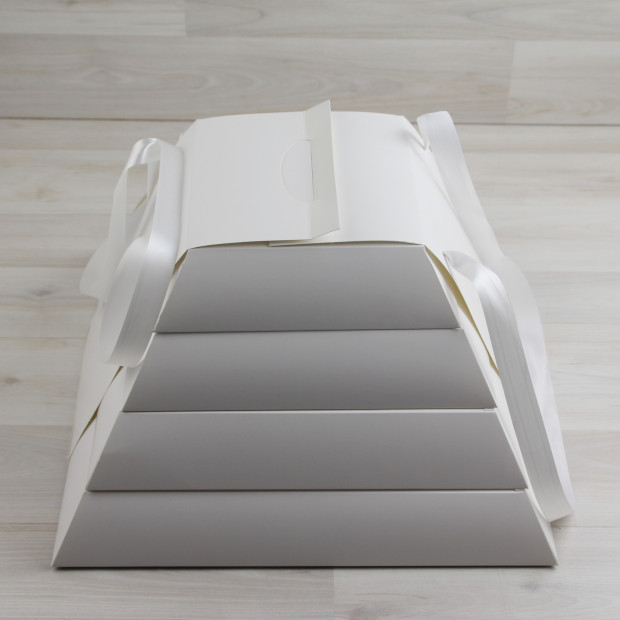 Коробка состоит из 4 ярусов, разных размеров, установленных друг на друга и скрепленных картонным поясом. Сверху накрывается куполом в виде пирамиды. К картонному поясу крепятся ручки из тканой ленты на надежном фиксаторе, которые выпускаются наружу в прорези в куполе и используются для переноски коробки. Это очень удобно в использовании.